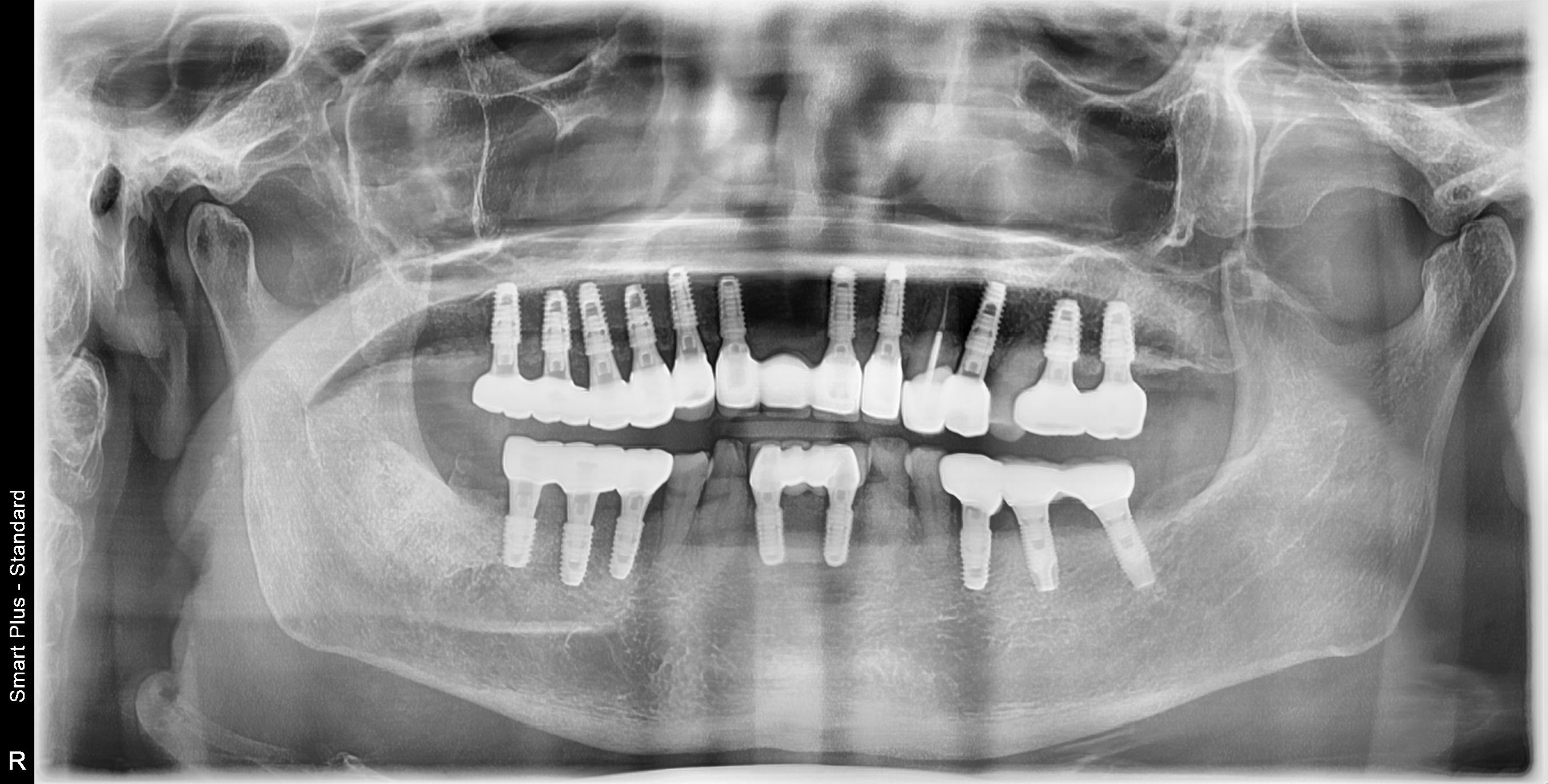 전체적으로 얇은 뼈를 가진 노인에서, 흔들리는 치아들을 빼고 임플란트와 보철치료를 시행하였습니다.