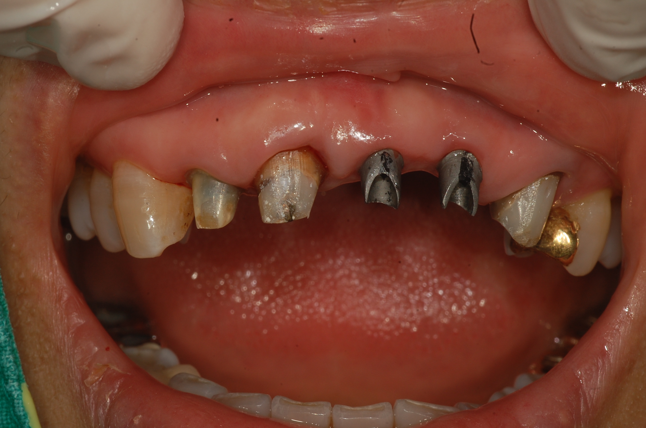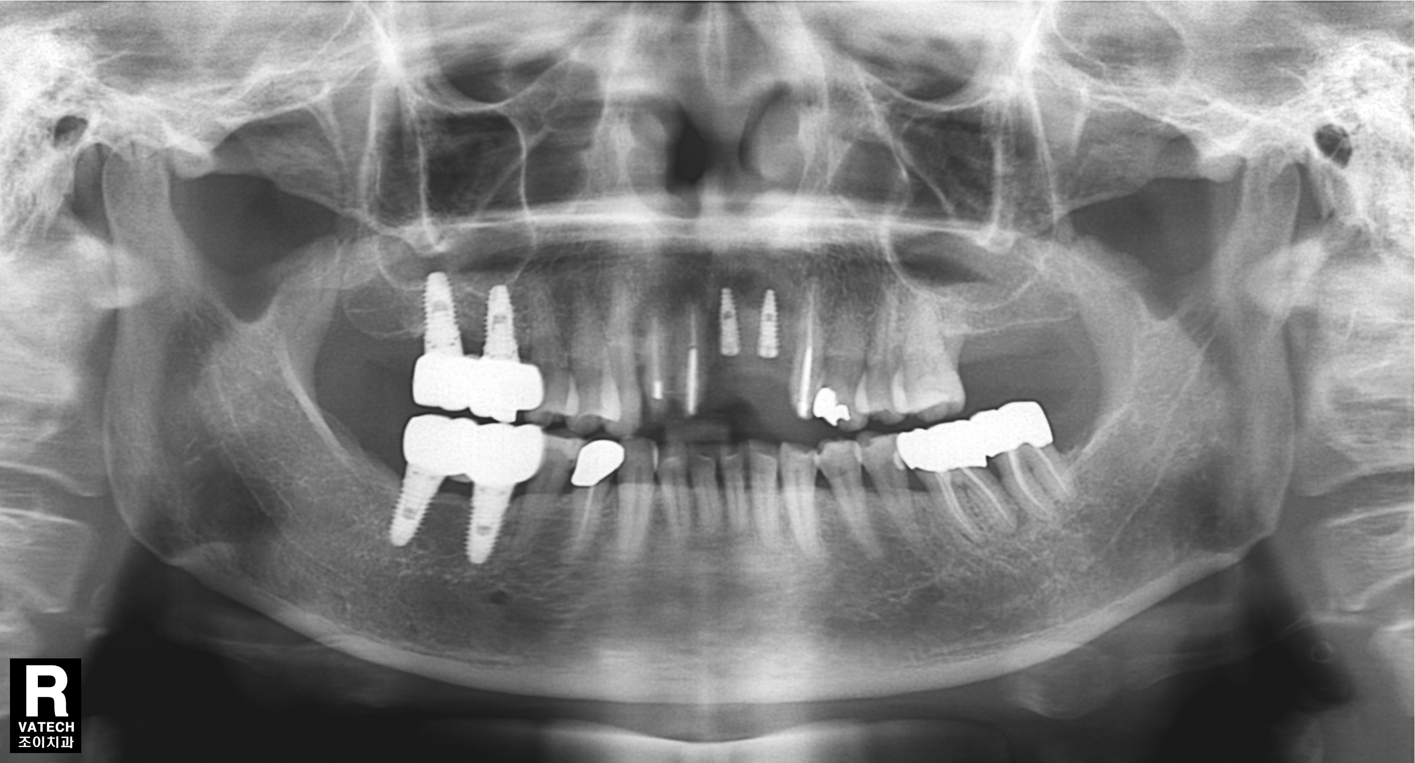 오래된 보철의 파절로 일부는 임플란트로 일부는 치아 재보철로 치료하였습니다.