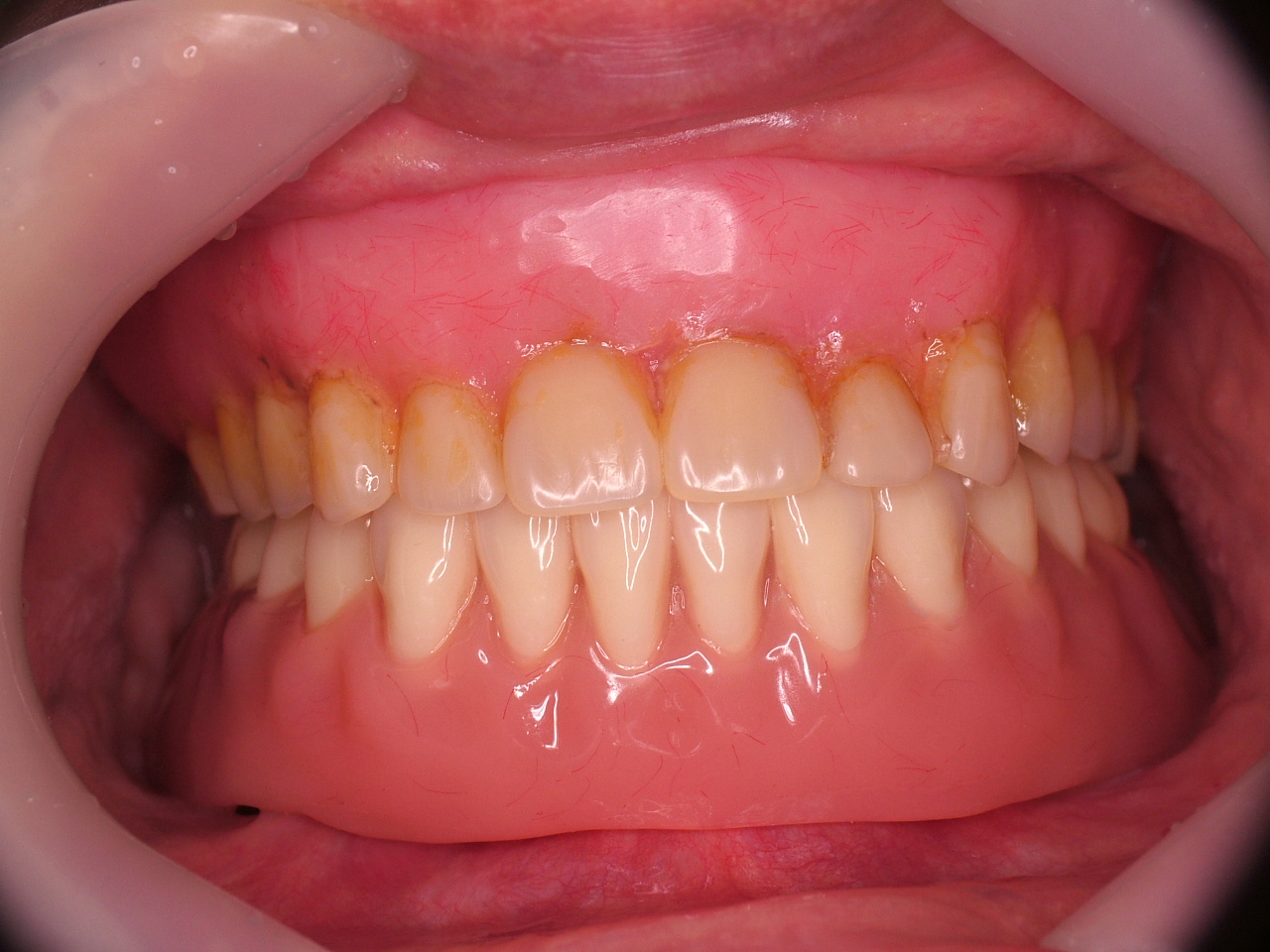 오랜 틀니 사용으로 어금니쪽에 뼈가 녹고 신경관이 가까와져서 임플란트를 심을 수 없었습니다, 차선책으로 앞쪽으로만 하악 임플란트 4개를 심고 후방연장된 바를 제작한 후 그 위에 틀니를 제작하였습니다.